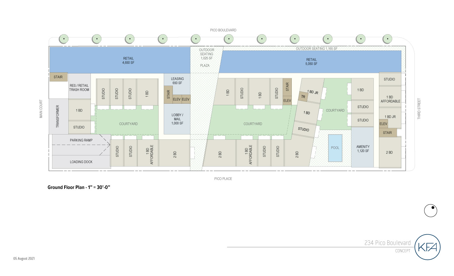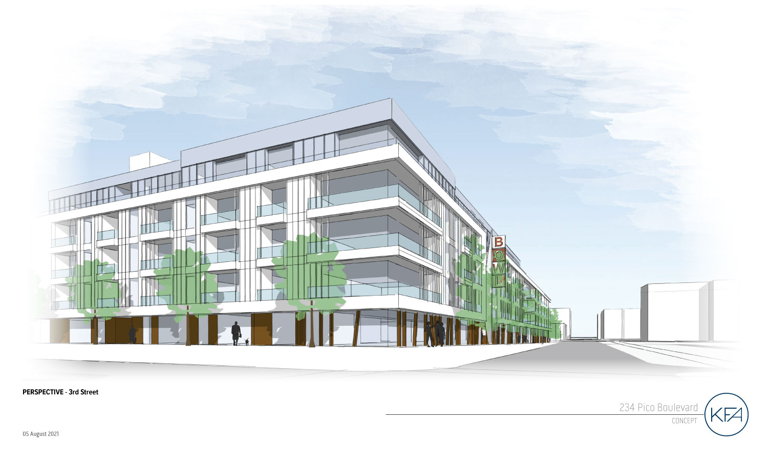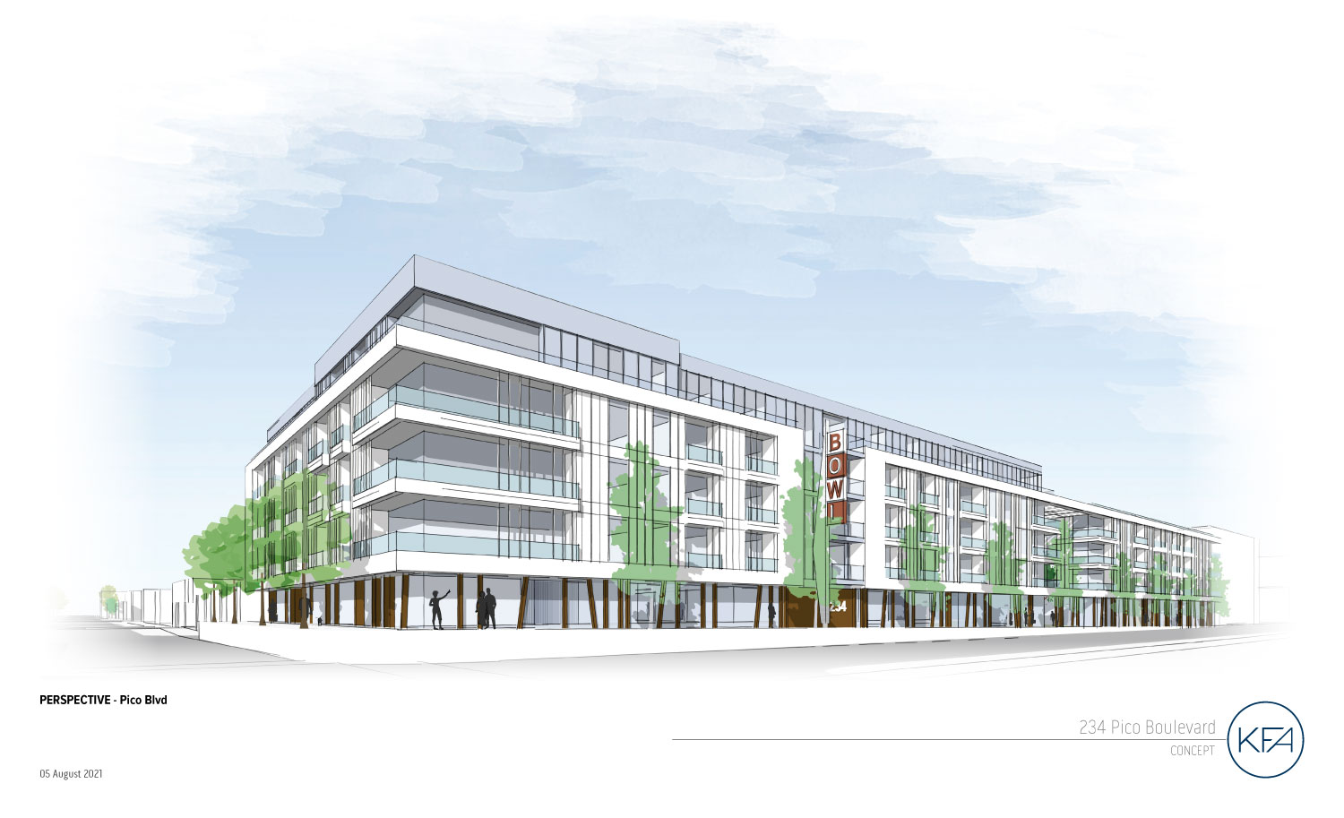 The proposed project consists of a 5-story mixed-use building across two structures including 200 residential units (including 21 deed-restricted affordable units), ground floor neighborhood-serving retail space, and 3 levels of subterranean parking with 384 total parking spaces and 301 total bicycle parking spaces. The proposed height of the project is 58 feet.
