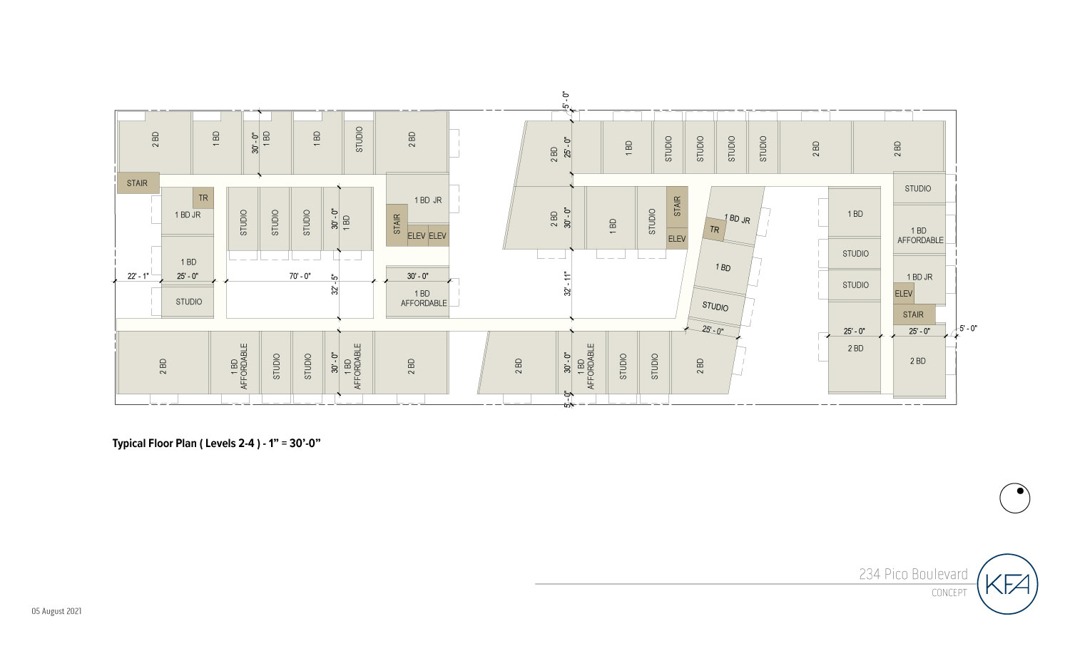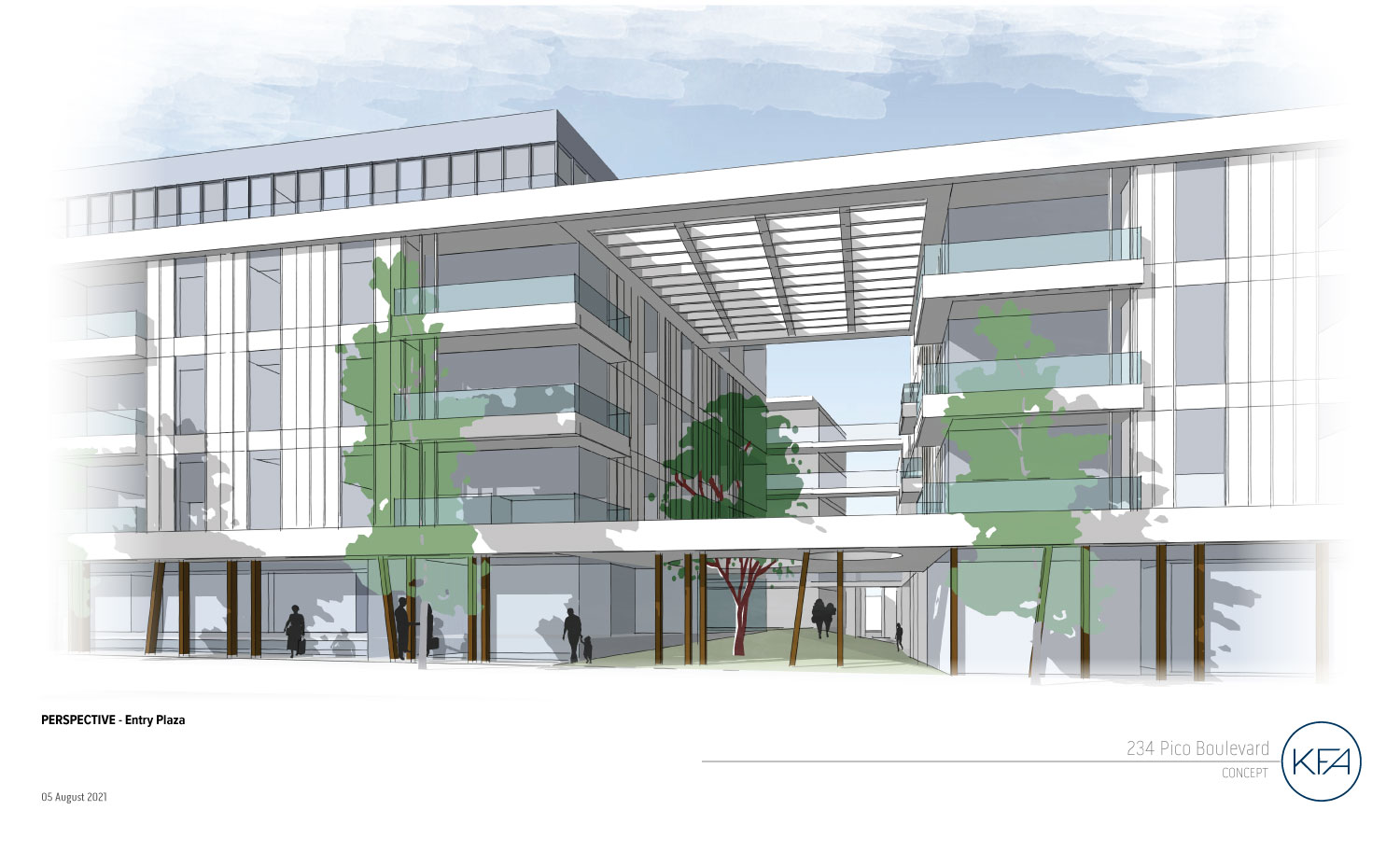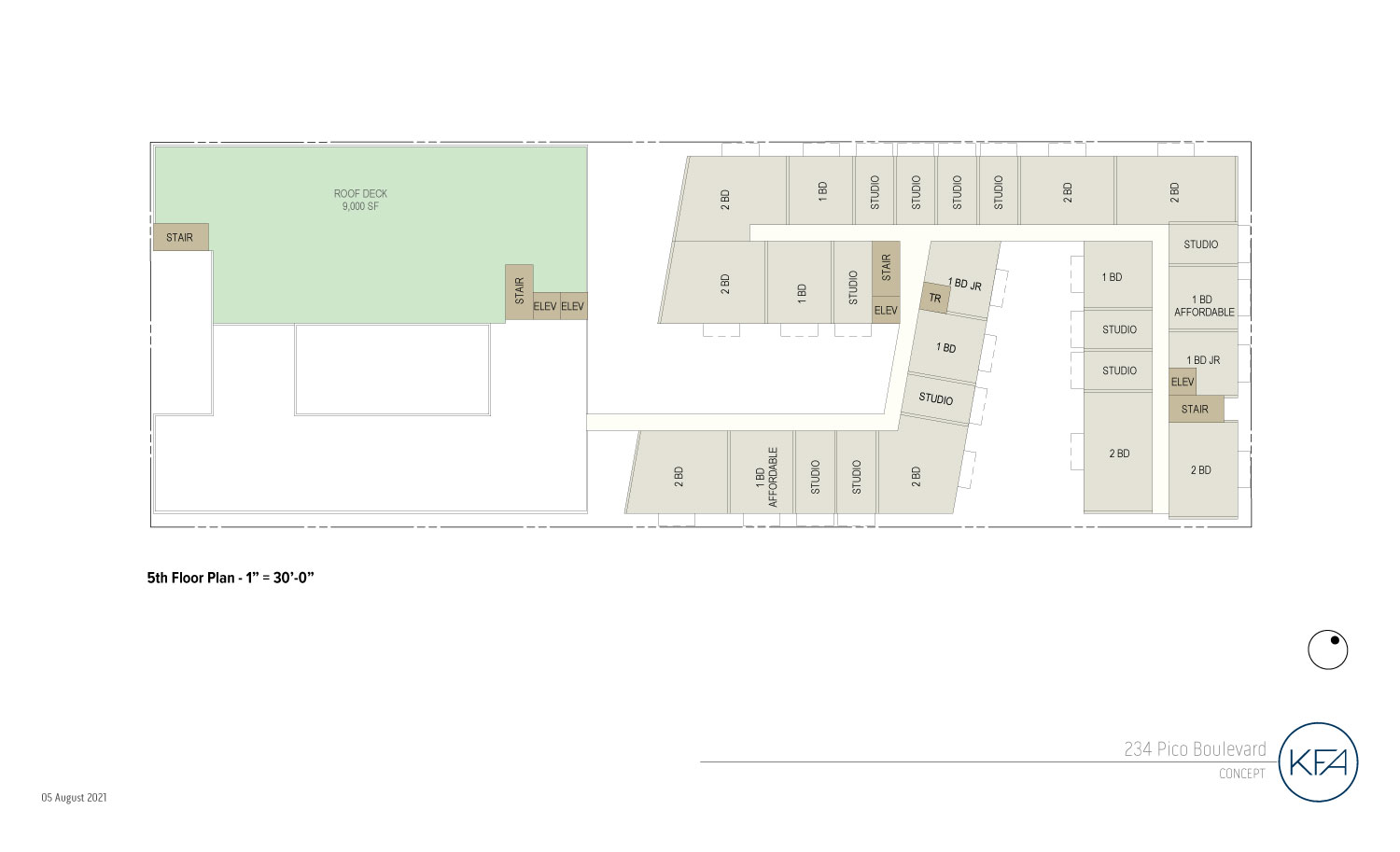 The proposed project consists of a 5-story mixed-use building across two structures including 200 residential units (including 21 deed-restricted affordable units), ground floor neighborhood-serving retail space, and 3 levels of subterranean parking with 384 total parking spaces and 301 total bicycle parking spaces. The proposed height of the project is 58 feet.